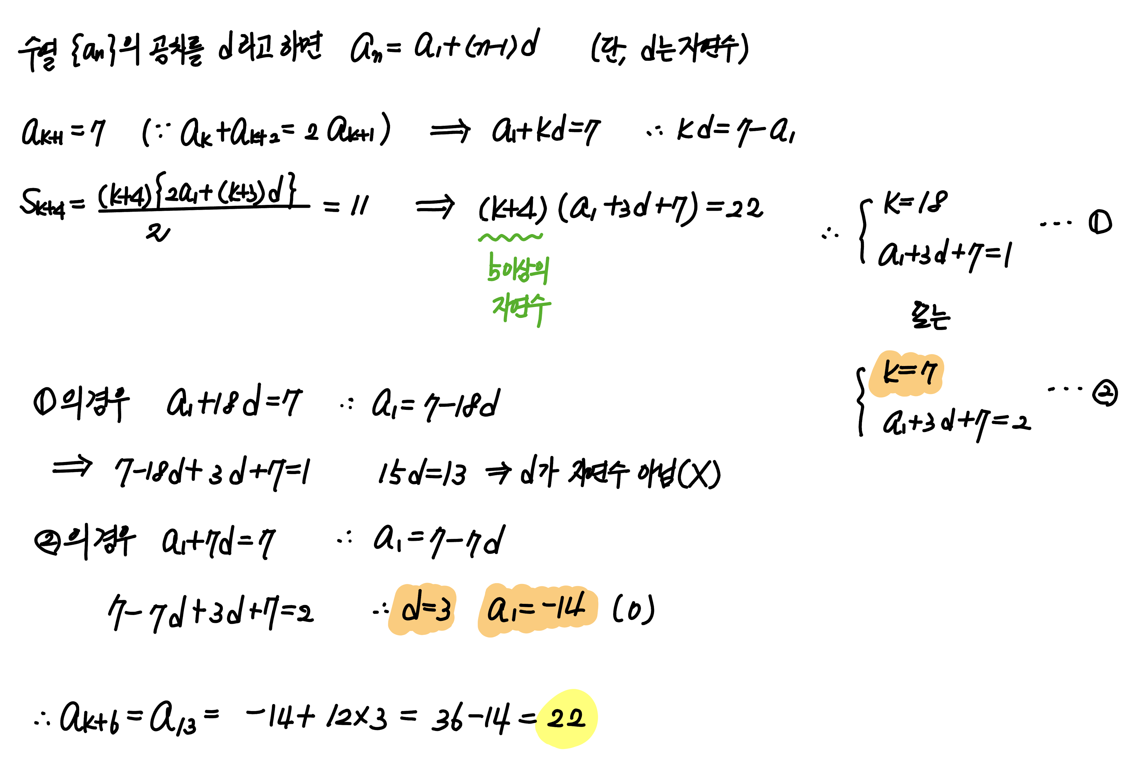공차가 자연수인 등차수열 $\{a_n\}$ 의 첫째항부터 제$n$항까지의 합을 $S_n$ 이라 하자. 어떤 자연수 $k$ 에 대하여 $$a_k + a_{k+1}+a_{k+2}=21, \quad S_{k+4}=11$$ 이 성립할 때, $a_{k+6}$ 의 값을 구하시오.