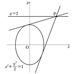 직선 \( y=2\) 위의 점 \( \rm P\) 에서 타원 \(x^2 +\dfrac{y^2}{2}=1\) 에 그은 두 점선의 기울기의 곱이 \(\dfrac{1}{3}\) 이다. 점 \(\rm P\) 의 \(x\) 좌표를 \(k\) 라 할 때, \(k^2\) 의 값은? ① \(6\) ② \(7\) ③ \(8\) ④ \(9\) ⑤ \(10\) 정답 ②