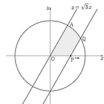 그림과 같이 원점 \(\rm O\) 를 중심으로 하고 반지름의 길이가 \(10\) 인 원이 있다. 직선 \(y= \sqrt{3} x\) 와 원이 제1사분면에서 만나는 점을 \(\rm A\) 라 하자. 점 \(\rm P\) 는 원점 \(\rm O\) 를 출발하여 \(x\) 축을 따라 양의 방향으로 매초 \(2\) 의 일정한 속력으로 움직인다. 점 \(\rm P\) 가 원점 \(\rm O\) 를 출발하여 \(t\) 초가 되는 순간, 점 \(\rm P\) 를 지나고 직선 \(y=\sqrt{3}x\) 에 평행한 직선이 제1사분면에서 원과 만나는 점을 \(\rm Q\) 라 하자. 세 선분 \(\rm AO, \; OP, \; PQ\) 와 호 \(\rm QA\) 로 둘러싸인 부분의 넓이를 \(S\)라 할 때, 점 \..