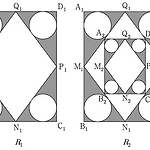 그림과 같이 $\overline{\rm A_1D_1}=3, \; \overline{\rm A_1B_1}=4$ 인 직사각형 $\rm A_1B_1C_1D_1$ 의 변 $\rm A_1B_1, \; B_1C_1, \; C_1D_1, \; D_1A_1$ 의 중점을 각각 $\rm M_1, \; N_1, \; P_1, \; Q_1$ 이라 하고, 이 점들을 연결하여 사각형 $\rm M_1N_1P_1Q_1$ 을 만든다.삼각형 $\rm A_1M_1Q_1, \; B_1N_1M_1, \; C_1P_1N_1, \; D_1Q_1P_1$ 에 각각 내접하는 원을 그리고, 각 삼각형의 내부와 내접하는 원의 외부의 공통부분에 색칠하여 얻은 그림을 $R_1$ 이라 하자.그림 $R_1$ 에서 사각형 $\rm M_1N_1P_1Q_1$ 에 내..