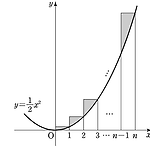 그림과 같이 $x$ 좌표가 $1, \;2,\;3,\; \cdots, \; n$ 인 $x$ 축 위의 점에서 $y$ 축에 평행한 직선을 그어 곡선 $y=\dfrac{1}{2}x^2$ 과 만나는 점을 꼭짓점으로 하는 직사각형을 $n$ 개 만든다. 이 직사각형들이 곡선 $y=\dfrac{1}{2}x^2$ 에 의하여 잘려진 윗부분들의 넓이의 합을 $S_n$ 이라 할 때, $\lim \limits_{n \to \infty} \dfrac{S_n}{n^2+1}=\dfrac{q}{p}$ 이다. $p^2+q^2$ 의 값을 구하시오. (단, $p$ 와 $q$ 는 서로소인 자연수이다) 정답 $17$