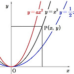 제 \(1\) 사분면에 속하고 곡선 \(y=x^2\) 위에 있는 임의의 점 \({\rm P}(x, \;y)\) 에서 \(x\) 축에 평행인 직선과 \(y\) 축에 평행인 직선을 오른쪽 그림과 같이 그었다. 이 두 직선과 곡선 \(y=\dfrac{1}{2}x^2\), \(y=ax^2\) \((a>0)\) 에 의해 둘러싸인 부분의 넓이를 곡선 \(y=x^2\) 이 이등분할 때, \(a\) 의 값을 구하여라. 정답 \(\dfrac{16}{9}\)
