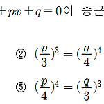 사차방정식 \(x^4 +px+q=0\) 이 중근을 가질 조건은? (단, \(p,\;q\) 는 실수) ① \(\left ( {\Large \frac{p}{2}} \right ) ^2 =\left ( {\Large \frac{q}{3}} \right )^3\) ② \(\left ( {\Large \frac{p}{3}} \right ) ^3 =\left ( {\Large \frac{q}{4}} \right )^4\) ③ \(\left ( {\Large \frac{p}{4}} \right ) ^3 =\left ( {\Large \frac{q}{3}} \right )^4\) ④ \(\left ( {\Large \frac{p}{3}} \right ) ^4 =\left ( {\Large \frac{q}{4}} \ri..