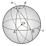 그림과 같이 반지름의 길이가 \(1\) 인 구의 중심 \(\rm O\) 를 지나 세 평면 \(\alpha, \; \beta ,\; \gamma\) 가 다음 조건을 만족시킨다. (가) 두 평면 \(\alpha, \; \beta\) 가 이루는 예각의 크기는 \(\dfrac{\pi}{3}\) 이다.(나) 두 평면 \(\beta, \; \gamma \) 가 이루는 예각의 크기는 \(\dfrac{\pi}{2}\) 이다. 두 점 \(\rm A, \; B\) 는 각각 두 평면 \(\beta , \; \gamma\) 의 교선, 두 평면 \(\gamma, \; \alpha\) 의 교선이 구와 만나는 점이고 호 \(\rm AB\) 의 길이는 \(\dfrac{\pi}{6}\) 이다. 두 평면 \(\alpha , \; \ga..