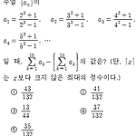 수열 \(\left \{ a_n \right \}\) 이 \(a_1 = {\dfrac {2^2 +1}{2^2 -1}},\;\;\;a_2 = {\dfrac{3^2+1}{3^2-1}},\;\;\;a_3 = {\dfrac{4^2+1}{4^2-1}},\;\;\;a_4 = {\dfrac{5^2+1}{5^2-1}},\;\;\;\cdots \) 일 때, \(\sum\limits_{k = 1}^{10} {{a_k} - \left[ {\sum\limits_{k = 1}^{10} {{a_k}} } \right]} \) 의 값은? (단, \([x]\) 는 \(x\) 보다 크지 않은 최대의 정수이다.) ① \(\dfrac{43}{132}\) ② \(\dfrac{41}{132}\) ③ \(\dfrac{13}{44}\) ④ \(..
