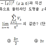 함수 \(f(x)=\sqrt{[x]+1-\left ( x- [x] \right )^2 }\;\; (x \ge 0)\) 과 직선 \(x=n-1,\; x=n\) 및 \(x\) 축으로 둘러싸인 도형을 \(x\) 축의 둘레로 회전시킨 도형의 부피를 \(V_n\) 이라 할 때, \(\lim \limits _{n \to \infty} \dfrac{\sum \limits _{k=1}^{n} V_k }{n^2}\) 의 값은? (단, \([x]\) 는 \(x\) 보다 크지 않은 최대의 정수) ① \(\dfrac{\pi}{2}\) ② \(\pi\) ③ \(\dfrac{3\pi}{2}\) ④ \(2\pi\) ⑤ \(\dfrac{5\pi}{2}\) 정답 ①