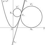 그림과 같이 자연수 $n$ 에 대하여 곡선 $y=x^2$ 위의 점 ${\rm P}_n \left ( n, \; n^2 \right ) $ 에서의 접선을 $l_n$ 이라 하고, 직선 $l_n$ 이 $y$ 축과 만나는 점을 ${\rm Y}_n$ 이라 하자. $x$ 축에 접하고 점 ${\rm P}_n$ 에서 직선 $l_n$ 에 접하는 원을 $C_n$, $y$ 축에 접하고 점 ${\rm P}_n$ 에서 직선 $l_n$ 에 접하는 원을 $C'_n$ 이라 할 때, 원 $C_n$ 과 $x$ 축과의 교점을 ${\rm Q}_n$, 원 $C'_n$ 과 $y$ 축과의 교점을 ${\rm R}_n$ 이라 하자. $\lim \limits_{n \to \infty} \dfrac{\overline{{\rm OQ}_n}}{\overl..