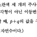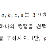 집합 \(X\)를 \[X = \left\{ {\left. {\left( {\matrix{a & b \cr c & d } } \right)\;} \right|\;a,\;b,\;c,\;d\;는\;3\;이하의\;자연수 } \right\}\]라 하자. 집합 \(X\)에서 임의로 하나의 행렬을 선택할 때, 그 행렬이 역행렬을 가질 확률은 \(\Large \frac{q}{p}\)이다. \(p+q\)의 값을 구하시오. (단, \(p,\;q\)는 서로소인 자연수이다.) 정답 49