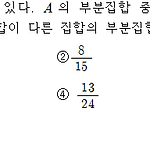 집합 \(A= \left \{ 1,\;2,\;3,\;4\right \}\)가 있다. \(A\)의 부분집합 중에서 임의로 서로 다른 두 집합을 택하였을 때, 한 집합이 다른 집합의 부분집합이 될 확률은? ① \(\Large \frac{7}{12}\) ② \(\Large \frac{8}{15}\) ③ \(\Large \frac{11}{20}\) ④ \(\Large \frac{13}{24}\) ⑤ \(\Large \frac{15}{28}\) 정답 ④