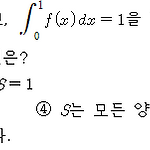 \( f(x) \) 가 \( x \) 에 대한 일차식이고, \( \displaystyle \int_{0}^{1} f(x) {\rm d } x = 1 \) 을 만족할 때, \( S = \displaystyle \int_{0}^{1} \left\{ f(x) \right\}^2 {\rm d } x \) 에 대한 다음 설명 중 옳은 것은? ① \( -1 1\) ④ \(S\)는 모든 양수값을 가진다. ⑤ \(S\)는 모든 실수 값을 가진다. 정답 ③