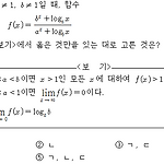 \(a>0,\;\;b>0,\;\;a\ne 1,\;\; b \ne 1\) 일 때, 함수 \[f(x)=\dfrac{b^x +\log _a x}{a^x + \log _b x}\] 에 대하여 에서 옳은 것만을 있는 대로 고른 것은? ㄱ. \(11\) 이다. ㄴ. \(b