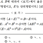 두 이차정사각행렬 \(A,\;B\) 에 대하여 에서 옳은 것을 모두 고른 것은? (단, \(O\) 는 영행렬이고, \(E\) 는 단위행렬이다.) ㄱ. \(A+B=AB\) 이면 \((A-E)^{-1} = B-E\) 이다. ㄴ. \(AB+BA=E,\;\; A^2 =B^2 = O \) 이면 \((AB)^2 = AB\) 이다. ㄷ. \(A^2 = E\) 이면 \((E-A)^4 = 2^3 (E-A) \) 이다. ① ㄱ ② ㄴ ③ ㄱ, ㄴ ④ ㄴ, ㄷ ⑤ ㄱ, ㄴ, ㄷ 정답 ⑤