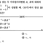 역행렬을 갖는 두 이차정사각행렬 \(A,\;B\) 에 대하여 \(AB^{-1} = \left ( \matrix {1 & 1 \\ 0 & -1} \right ) \) 이 성립할 때, 에서 항상 옳은 것을 모두 고른 것은? ㄱ. \(AB^{-1} = BA^{-1}\) ㄴ. \(A^{-1} B=B^{-1} A\) ㄷ. \(A^{-1} B = BA^{-1}\) ① ㄱ ② ㄴ ③ ㄱ, ㄴ ④ ㄴ, ㄷ ⑤ ㄱ, ㄴ, ㄷ 정답 ③