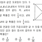 그림과 같은 도로망이 있다. 5개의 지점 \(\rm A,\;B,\;C,\;D,\;E\) 에서 각각의 길을 선택할 확률은 모두 같다. 즉, \(\rm A\)에서 \(\rm B,\;E,\;D\) 에 갈 확률은 각각 \(\dfrac{1}{3}\)이고, \(\rm E\) 에서 \(\rm A,\;B,\;C,\;D\) 에 갈 확률은 각각 \(\dfrac{1}{4}\)이다. 한 번에 바로 연결된 다른 지점으로만 갈 수 있을 때, \(\rm A,\;C\) 두 지점에 각각 있던 갑과 을이 동시에 움직여 두 번째 이동 후 처음으로 만날 확률은? ① \(\dfrac{5}{36}\) ② \(\dfrac{4}{27}\) ③ \(\dfrac{5}{27}\) ④ \(\dfrac{7}{36}\) ⑤ \(\dfrac{7}{27}\) ..
