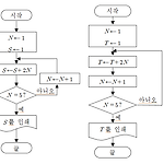 두 순서도에서 인쇄되는 \( S \) 와 \( T \) 에 대하여 \( S - T \) 의 값은? ① \(-12\) ② \(-10\) ③ \(0\) ④ \(10\) ⑤ \(12\) 정답 ④