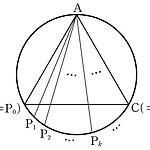 그림과 같이 반지름의 길이가 1인 원에 내접하는 정삼각형 \(\rm ABC\) 가 있다. 호 \(\rm BC\) 를 \(n\) 등분하여 양 끝점을 포함한 각 등분점을 차례로 \[{\rm P}_0 (={\rm B}), {\rm P}_1,\; {\rm P}_2 ,\; {\rm P}_3,\; \cdots, \; {\rm P}_{n-1}, \;{\rm P}_n (={\rm C})\] 이라 할 때, \(\lim \limits_{n \to \infty} \dfrac{\pi}{n} \sum \limits_{k=1}^{n} \overline{{\rm AP}_k}\) 의 값은? ① \(6\) ② \(7\) ③ \(8\) ④ \(9\) ⑤ \(10\) 정답 ①