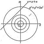 좌표평면에서 자연수 \(n\) 에 대하여 직선 \(y=x+n\) 과 \(n\) 개의 원 \(x^2+y^2=2k^2\; (k=1,\;2,\;3,\; \cdots,\;n)\) 의 서로 다른 교점의 개수를 \(a_n\) 이라 하자. \(\sum \limits_{n=1}^{20} a_n\) 의 값을 구하시오. 정답 \(230\)