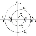 그림과 같이 \(\rm A_1 (1,\;0),\;\;A_2 (-1,\;0),\;\;A_3 (2,\;0), \;\;A_4 (-2,\;0),\;\;\cdots\) 에 대하여 \(\overline {\rm OA_1}\) 을 지름으로 하는 반원을 \(C_1\), \(\overline{\rm A_1 A_2}\) 를 지름으로 하는 반원을 \(C_2\), \(\overline{\rm A_2 A_3}\) 를 지름으로 하는 반원을 \(C_3\)라 하자. 이와 같은 방법으로 만든 반원 \(C_k\;\;(k=1,\;2,\;3,\;\cdots)\) 의 호의 길이를 \(l_k\) 라 하자. \(\sum \limits_{k=1}^{n} l_k =189 \pi\) 를 만족시키는 \(n\) 에 대하여, \({\rm A}_n\) 의 ..