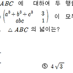 오른쪽 그림과 같은 \( \triangle \rm ABC\) 에 대하여 두 행렬 \( A= \left ( \matrix { 2 & a \cr \sin {\rm A} & \sin {\rm B} } \right ),\;\;B=\left ( \matrix { {a^3 + b^3 + c^3 } & 3 \cr {abc} & 1} \right ) \) 이 모두 역행렬을 갖지 않을 때, \( \triangle {\rm ABC} \) 의 넓이는? ① \( \Large \frac {\sqrt {3}}{4} \) ② \( \Large \frac {\sqrt {3}}{2} \) ③ \( \sqrt {3} \) ④ \( 2 \sqrt {3} \) ⑤ \( 4 \sqrt {3} \) 정답 ③