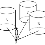 다음은 어떤 전시장에 밑면의 반지름의 길이가 $1 \rm m$ 인 원기둥 모양의 세 전시물 $\rm A, \; B, \;C$ 를 설치하는 방법이다.(가) 관람지점 $\rm P$ 에서 전시물 $\rm A, \;B$ 의 밑면의 중심까지의 거리가 각각 $2 \rm m$ 이고, 관람지점 $\rm P$ 와 전시물 $\rm A, \;B$ 의 밑면의 중심을 연결한 두 직선이 서로 수직이 되도록 전시물 $\rm A, \; B$ 를 설치한다.(나) 관람자가 관람지점 $\rm P$ 에서 전시물 $\rm A, \; B$ 사이로 전시물 $\rm C$ 를 보았을 때, 전시물 $\rm C$ 가 전시물 $\rm A, \; B$ 에 의해 가려지는 부분이 없도록 전시물 $\rm C$ 를 설치한다. 관람지점 $\rm P$ 로부터 전시물..