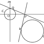 좌표평면에 두 원 $$C_1 : x^2+y^2=1, \;\; C_2:x^2+y^2-8x+6y+21=0$$ 이 있다. 그림과 같이 $x$ 축 위의 점 $\rm P$ 에서 원 $C_1$ 에 그은 한 접선의 접점을 $\rm Q$, 점 $\rm P$ 에서 원 $C_2$ 에 그은 한 접선의 접점을 $\rm R$ 라 하자. $\overline{\rm PQ}= \overline{\rm PR}$ 일 때, 점 $\rm P$ 의 $x$ 좌표는? ① $\dfrac{19}{8}$ ② $\dfrac{5}{2}$ ③ $\dfrac{21}{8}$ ④ $\dfrac{11}{4} $ ⑤ $\dfrac{23}{8}$ 정답 ④