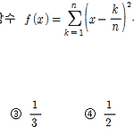 자연수 (n\) 에 대하여 이차함수 \(f(x)=\sum \limits _{k=1}^{n} \left ( x - {\dfrac{k}{n}} \right ) ^2 \) 의 최솟값을 \(a_n\) 이라 할 때, \(\lim \limits _{n \to \infty} {\dfrac {a_n}{n}} \) 의 값은? ① \(\dfrac{1}{12}\) ② \(\dfrac{1}{6}\) ③ \(\dfrac{1}{3}\) ④ \(\dfrac{1}{2}\) ⑤ \(1\) 정답 ①