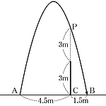 그림과 같이 평평한 지면 위에 있는 두 지점 $\rm A, \; B$ 사이의 거리는 $6 \rm m$ 이다. 두 지점 $\rm A, \; B$ 에서 각각 $4.5 \rm m, \; 1.5m$ 떨어진 $\rm C$ 지점에 지면과 수직으로 높이가 $3 \rm m$ 인 기둥이 세워져 있다. $\rm A$ 지점에서 쏘아올린 공이 포물선 모양으로 날아 기둥의 꼭대기에서 지면에 수직으로 $3 \rm m$ 위의 점 $\rm P$ 지점을 지나 $\rm B$ 지점에 떨어졌다. 이 공이 가장 높이 올라갔을 때의 지면으로부터의 높이는? (단, 포물선의 축은 지면에 수직이고, 공의 크기와 기둥의 굵기는 생각하지 않는다.)① $\rm 7.5m$ ② $8\rm m$ ③ $\rm 8.5 m$ ④ $\rm 9m$ ⑤ $\rm 9.5..