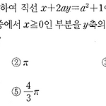 모든 실수 \(a\) 에 대하여 직선 \(x+2ay=a^2 +1\) 이 지나지 않는 영역을 \(A\) 라 하자. 영역 \(A\) 중에서 \(x \ge 0\) 인 부분을 \(y\) 축의 둘레로 회전하여 생긴 회전체의 부피는? ① \(\dfrac{3}{4}\pi\) ② \(\pi\) ③ \(\dfrac{16}{15}\pi\) ④ \(\dfrac{6}{5}\pi\) ⑤ \(\dfrac{4}{3}\pi\) 정답 ③