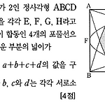 한 변의 길이가 \(2\) 인 정사각형 \(\rm ABCD\) 의 각 변의 중점을 각각 \(\rm E,\; F,\; G,\; H\) 라고 하자. 그림과 같이 합동인 \(4\) 개의 포물선으로 둘러싸인 어두운 부분의 넓이가 \(\dfrac{b\sqrt{2}}{a}- \dfrac{d}{c}\) 일 때, \(a+b+c+d\) 의 값을 구하시오. (단, \(a\) 와 \(b\), \(c\) 와 \(d\) 는 각각 서로소인 자연수이다.) 정답 21
