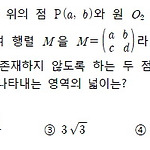 원 \({\rm O_1} \;:\; (x-2)^2 +y^2 =1\) 위의 점 \({\rm P}(a,\;b)\) 와 원 \({\rm O_2} \;:\; (x-m)^2 +(y-n)^2 =1\) 위의 점 \({\rm Q}(c,\;d)\) 에 대하여 행렬 \(M\) 을 \(M = \left( {\begin{array}{ll}a&b\\c&d\end{array}} \right)\) 라 정의하자 \(0 \le m \le 2\) 일 때, 행렬 \(M\) 의 역행렬이 존재하지 않도록 하는 두 점 \(\rm P,\;Q\) 가 존재하기 위한 점 \((m,\;n)\)이 좌표평면에 나타내는 영역의 넓이는? ① \(3\sqrt{2}\) ② \({\displaystyle \frac{7\sqrt{2}}{2}}\) ③ \(3\sqrt..
