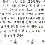 그림과 같이 둘레의 길이가 \(3\) 인 원을 삼등분하는 세 점 \(\rm A,\;B,\;C\) 가 있고, 각 점 위를 움직이는 말이 있다. 이 말은 한 개의 주사위를 던져 홀수의 눈이 나오면 시계방향으로 \(1\) 만큼 움직이고, 짝수의 눈이 나오면 그 수만큼 시계방향으로 움직인다. 예를 들면, 말이 \(\rm A\) 에서 출발할 때 주사위를 던져 \(3\) 이 나오면 \(\rm B\) 로 움직이고, 다시 주사위를 던져 \(2\) 가 나오면 \(\rm B\) 에서 \(\rm A\) 로 움직인다. \(\rm A\) 에서 출발한 말이 주사위를 \(n\) 번 던진 후, \(\rm A,\;B,\;C\) 에 있을 확률을 각각 \(p_n ,\; q_n ,\; r_n \) 이라 하면 \(p_{n+1} = ap_n ..