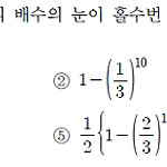 주사위를 \(10\) 번 던졌을 때, \(3\) 의 배수의 눈이 홀수번 나올 확률은? ① \(\left ( {\large \frac{1}{3}} \right )^{10}\) ② \(1-\left ( {\large \frac{1}{3}} \right )^{10}\) ③ \(\left ( {\large \frac{2}{3}} \right )^{10} \) ④ \({\large \frac{1}{2}} \left \{ 1- \left ( {\large \frac{1}{3}} \right )^{10} \right \}\) ⑤ \({\large \frac{1}{2}} \left \{ 1- \left ( {\large \frac{2}{3}} \right )^{10} \right \}\) 정답 ④