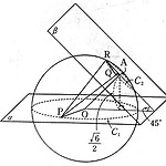 반지름의 길이가 \(2\) 인 구의 중심 \(\rm O\) 를 지나는 평면을 \(\alpha\) 라 하고, 평면 \(\alpha\) 와 이루는 각이 \(45^{\rm o}\) 인 평면을 \(\beta\) 라 하자. 평면 \(\alpha\) 와 구가 만나서 생기는 원을 \(C_1\), 평면 \(\beta\) 와 구가 만나서 생기는 원을 \(C_2\) 라 하자. 원 \(C_2\) 의 중심 \(\rm A\) 와 평면 \(\alpha\) 사이의 거리가 \(\dfrac{\sqrt{6}}{2}\) 일 때, 그림과 같이 다음 조건을 만족하도록 원 \(C_1\) 위에 점 \(\rm P\), 원 \(C_2\) 위에 두 점 \(\rm Q, \;R\) 를 잡는다. (가) \(\angle \rm QAR=90^{\rm o}\)..