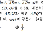 오른쪽 그림과 같이 \(\overline{\rm AB}=8,\; \overline{\rm AE}=6,\; \overline{\rm AD}=16\)인 직육면체 \(\rm ABCD-EFGH\)에서 변 \(\rm CD, \; GF\)를 \(3:5\)로 내분하는 점을 각각 \(\rm P,\;Q\)라 할 때, 평면 \(\rm ADGF\)와 평면 \(\rm APQ\)가 이루는 각의 크기를 \(\theta\)라 하자. 이 때, \(\cos \theta\)의 값은? ① \(\Large \frac{1}{3}\) ② \(\Large \frac{\sqrt{2}}{3}\) ③ \(\Large \frac{2}{3}\) ④ \(\Large \frac{2\sqrt{2}}{3}\) ⑤ \(\Large \frac{4}{3}\) 정답 ④