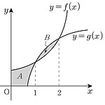 그림과 같이 함수 \(f(x)=ax^2 +b \;(x\geq 0)\) 의 그래프와 그 역함수 \(g(x)\) 의 그래프가 만나는 두 점의 \(x\) 좌표는 \(1\) 과 \(2\) 이다. \(0\leq x \leq 1\) 에서 두 곡선 \(y=f(x),\; y=g(x)\) 및 \(x\) 축, \(y\) 축으로 둘러싸인 부분의 넓이를 \(A\) 라 하고, \(1\leq x \leq 2\) 에서 두 곡선 \(y=f(x),\; y=g(x)\) 로 둘러싸인 부분의 넓이를 \(B\) 라 하자. 이때, \(A-B\) 의 값은? (단, \(a, \;b\) 는 상수이다.)① \(\dfrac{1}{9}\) ② \(\dfrac{2}{9}\) ③ \(\dfrac{1}{3}\) ④ \(\dfrac{4}{9}\) ⑤ \(\df..