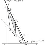 그림과 같이 직선 \(y=-2x+4\) 가 \(x\) 축, \(y\) 축과 만나는 점을 각각 \(\rm A, \; B\) 라 하자. 선분 \(\rm AB\) 를 \(n\) 등분한 점을 점 \(\rm B\) 에서 가까운 순서대로 \(\rm P_1 ,\; P_2 , \; P_3 ,\; \cdots, \; P_{{\it n}-1}\) 이라고 하고, 점 \({\rm P}_k \;(k=1,\;2,\;3,\; \cdots,\; n-1)\) 을 지나고 \(y\) 축에 평행한 직선과 직선 \(y=-x+2\) 가 만나는 점을 \(\rm Q_{\it k}\) 라 하자. 삼각형 \(\rm BP_{\it k} Q_{\it k}\) 의 넓이를 \(S_k\) 라 할 때, \(\lim \limits_{n \to \infty} \s..