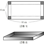[그림 1]과 같이 가로의 길이가 \(\rm 12cm\), 세로의 길이가 \(\rm 6cm\) 인 직사각형 모양의 종이가 있다. 네 모퉁이에서 크기가 같은 정사각형 모양의 종이를 잘라 낸 후 남는 부분을 접어서 [그림 2]와 같이 뚜껑이 없는 직육면체 모양의 상자를 만들려고 한다. 이 상자의 부피의 최댓값을 \(M \rm cm^3\) 이라 할 때, \(\dfrac{\sqrt{3}}{3}M \) 의 값을 구하시오. (단, 종이의 두께는 무시한다.) 정답 \(24\)