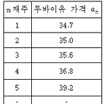 오른쪽 표는 어느 달 국내 원유 수입량의 \(70\%\) 를 차지하는 두바이(Dubai) 유의 \(1\) 배럴당 국제 가격을 일주일 간격으로 나타낸 것이다. 이 표에 있는 두바이유의 가격 \(a_n\) 은 다음 관계식을 만족한다. \[a_n = 34.4 + 0.3 \times b_n \;\;\; (단, \;n\; 은\; 자연수)\] 이러한 추세로 가격이 결정할 때, \(\sum \limits _{k=1}^{8} b_k \) 의 값을 구하시오. 정답 255