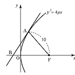 그림과 같이 포물선 \( y^2=4px\) 의 초점을 \(\rm F\) 라 하고, \(\overline{\rm FA}=10\) 을 만족하는 포물선 위의 점 \({\rm A}(a, \;b)\) 에서의 접선이 \(x\) 축과 만나는 점을 \(\rm B\) 라 하자. 삼각형 \(\rm ABF\) 의 넓이가 \(40\) 일 때, \(ab\) 의 값을 구하시오. (단, \( a