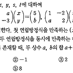 네 미지수 \(x,\;y,\;s,\;t\) 에 대하여 \[ \left ( \matrix { 4 & a \cr -6 & -3 } \right ) \left ( \matrix {x \cr y} \right ) = \left ( \matrix { 5 \cr b} \right ),\;\; \left ( \matrix{1 & -2 \cr a & 2 }\right ) \left ( \matrix {s \cr t} \right ) = \left ( \matrix { x \cr y } \right ) \] 인 관계가 성립한다. 첫 연립방정식을 만족하는 \((x,\;y)\) 의 해는 오직 한 쌍이고, 두 연립방정식을 동시에 만족하는 해 \(x,\;y,\;s,\;t\) 는 무수히 많이 존재할 때, 두 상수 \(a,\;b\..