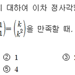 정수 \(a,\;b,\;c,\;d\) 에 대하여 이차 정사각행렬 \( A=\left ( \matrix{ a & b \cr c & d} \right) \) 가 \[A^2 = \left ( \matrix { 2k & 0 \cr 0 & 2k } \right ),\; A \left ( \matrix {1 \cr 1} \right) = \left ( \matrix {k \cr k^2} \right ) \] 을 만족할 때, 실수 \(k\) 의 값은? (단, \(k \neq 0 \)) ① \(-1\) ② \(1\) ③ \(2\) ④ \(3\) ⑤ \(4\) 정답 ③